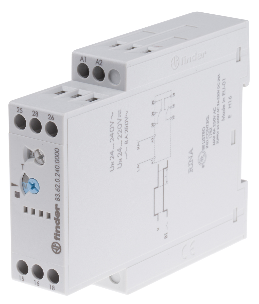 This is Power OFF Delay Single Timer Relay 0.05-180 s SPDT 2 Contacts DPDT 24 → 240 V ac/dc manufactured by Finder. The manufacturer part number is 83.62.0.240.0000. It has a maximum 265/242v ac/dc voltage . Furthermore, the product is 22.5mm wide. Features 24 → 240v ac/dc supply voltage. It also carries 8a maximum current. It has a standard 0.05-180s time range . Its mode of operation is power off delay . It includes a single functions timer . It has a maximum operating temperature of +60°c. The terminal is a screw type. Its time increment is in seconds . It includes a/an external power supply . It is created with a/an dpdt switch configuration . The contact is equipped with spdt configuration. Its accurate length is 78.8mm. It has a minimum 16.8v ac/dc voltage . The product is available in din rail configuration. The product 83 series, is a highly preferred choice for users. The product comes in 100.3mm depth. It has a minimum 8a current . Whereas, the minimum operating temperature of the product is -20°c. The product contains 2 contacts. The product is made from sturdy silver nickel materials.