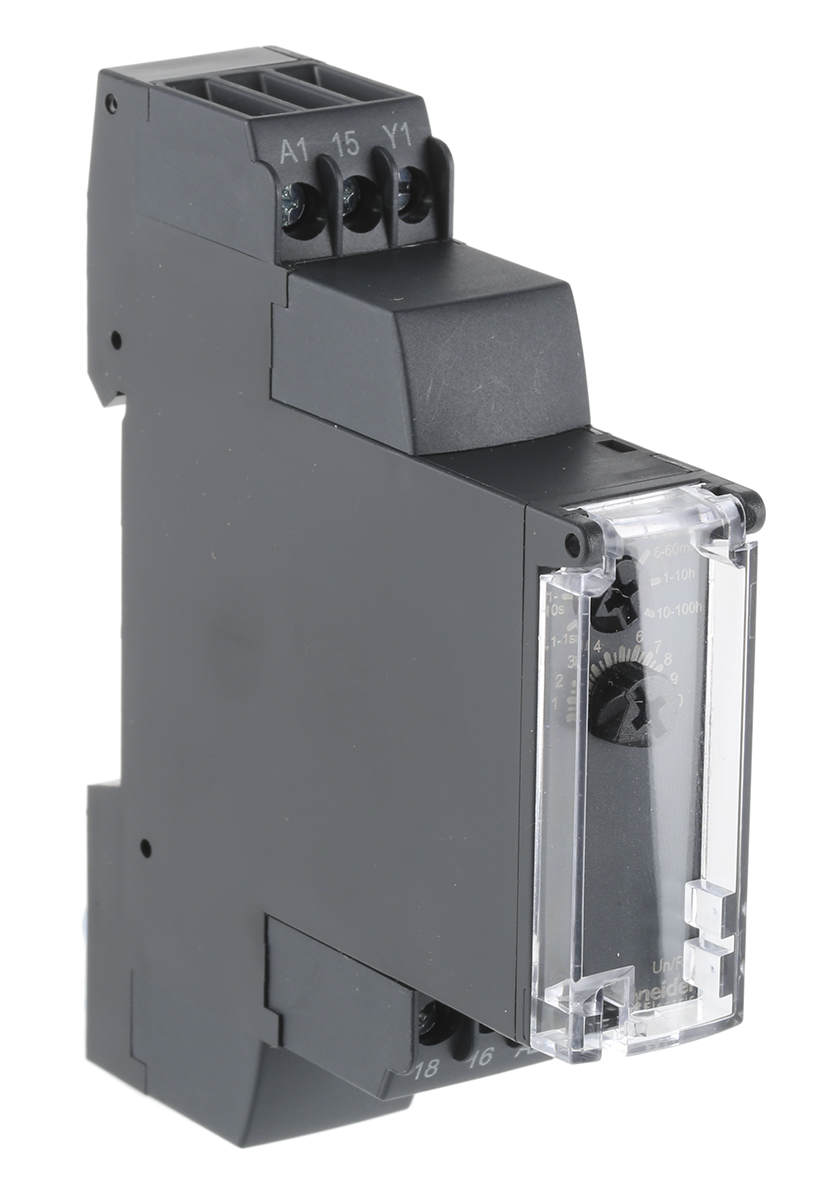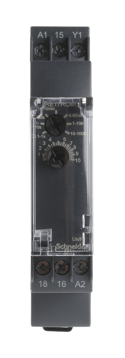 This is OFF Delay Single Timer Relay Screw 0.1 s → 100 h SPDT 2 Contacts SPDT manufactured by Schneider Electric. The manufacturer part number is RE17RCMU. It has a maximum 24 v dc, 240v ac voltage . Furthermore, the product is 17.5mm wide. Features 24 v dc, 24 → 240v ac supply voltage. It also carries 8a maximum current. It has a standard 0.1 s → 100h time range . Its mode of operation is off delay . It includes a single functions timer . It has a maximum operating temperature of +60°c. The terminal is a screw type. Additionally, its time delay is about <100ms . Whereas, the minimum operating temperature of the product is -20°c. Its time increment is in hours, minutes, seconds . It is created with a/an spdt switch configuration . The contact is equipped with spdt configuration. Its accurate length is 90mm. It has a minimum 24v ac voltage . Better World Verification Options - green premium. Is it a better world product? yes. The product is available in din rail configuration. The product harmony time, is a highly preferred choice for users. The product comes in 72mm depth. It has a minimum 10ma current . The product contains 2 contacts. The product is made from sturdy cadmium free materials.