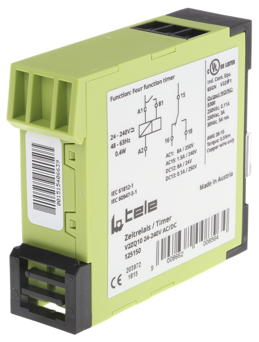 This is Interval Multi Function Timer Relay Screw manufactured by Tele. The manufacturer part number is V2ZQ10 24-240V AC/DC. Additionally, its time delay is about > 100ms . It also carries (dc-13) 0.1 a, (ac-15) 1.5 a, (ac-1) 8 a, (dc-12) 8a maximum current. The product is available in din rail configuration. The product v2zq10, is a highly preferred choice for users. It has a standard 0.05 → 1 s, 0.15 → 3 s, 0.5 → 10 h, 0.5 → 10 min, 0.5 → 10 s, 1.5 → 30 s, 3 → 60 min, 3 → 60 s, 5 → 100 h, 9 → 180s time range . It includes a/an internal power supply . Its accurate length is 76mm. Its mode of operation is interval . The contact is equipped with spdt configuration. Furthermore, the product is 22.5mm wide. The product comes in 67mm depth. Features 24 → 240v ac/dc supply voltage. Whereas, the minimum operating temperature of the product is -25°c. It includes a multi function functions timer . The product contains 1 contacts. It has a maximum operating temperature of +60°c. The terminal is a screw type. The product is made from sturdy silver alloy materials.