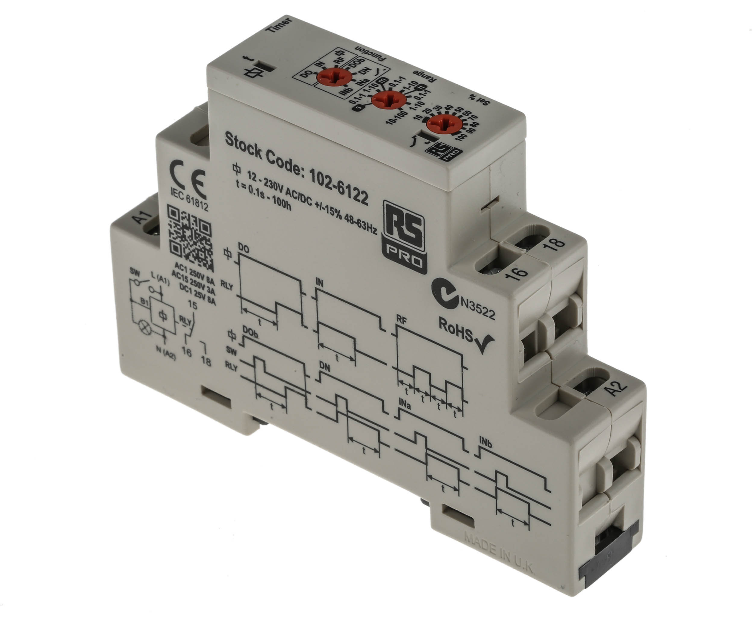 This is Multifunction Timer manufactured by RS Pro. The manufacturer part number is 102-6122. Additionally, its time delay is about 100ms . Its time increment is in hours, seconds . The product is available in din rail configuration. It also carries 8a maximum current. It has a maximum operating temperature of +60°c. It has a standard 0.1 s → 100h time range . It has a maximum 230v voltage . Its accurate length is 89mm. Its mode of operation is multifunction . The contact is equipped with spdt configuration. Furthermore, the product is 17.5mm wide. The product comes in 92mm depth. Features 12 → 230v ac/dc supply voltage. Whereas, the minimum operating temperature of the product is -20°c. It includes a multi function functions timer . It has a minimum 12v voltage . It is created with a/an spdt switch configuration . The terminal is a screw type.