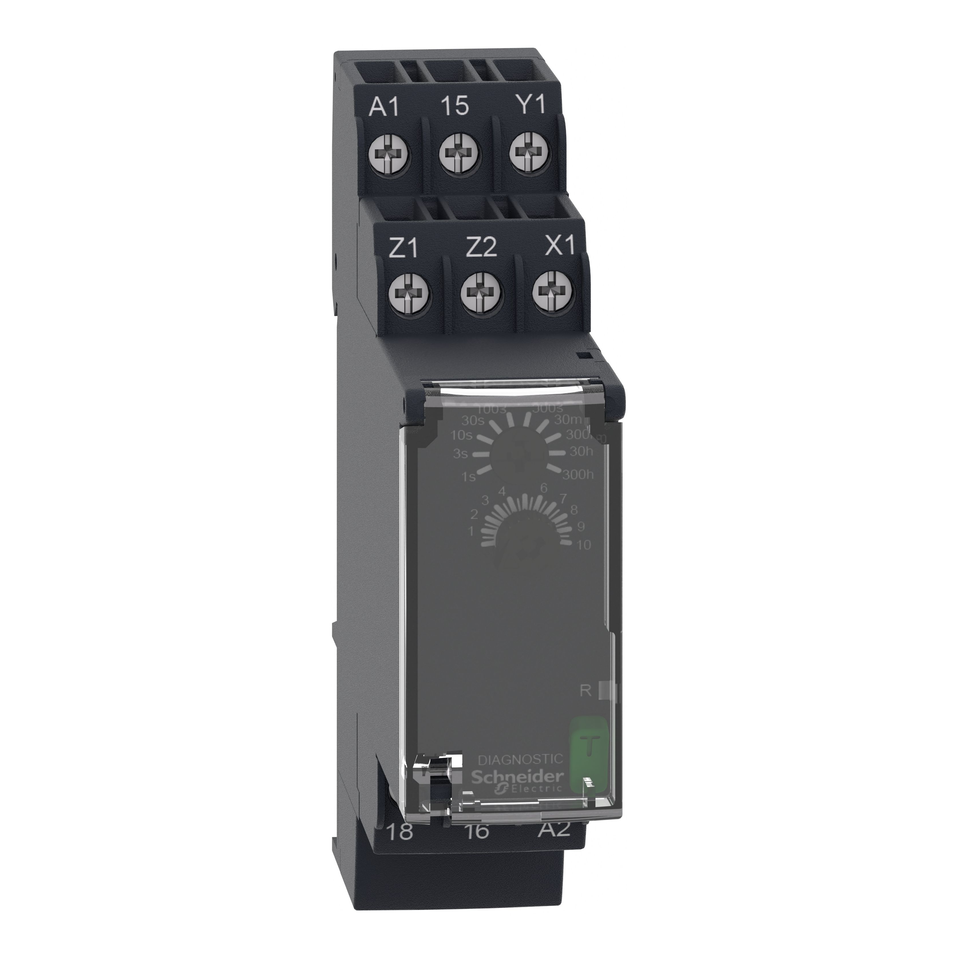 This is Off Delay On Delay Multi Function Timer Relay Screw manufactured by Schneider Electric. The manufacturer part number is RE22R1ACMR. It has a maximum 240v ac/dc voltage . Furthermore, the product is 90mm wide. Features 24 → 240v ac/dc supply voltage. It also carries 8a maximum current. It has a standard 0.05 → 1 s, 0.3 → 3 s, 1 → 10 s, 10 → 100 s, 3 → 30 h, 3 → 30 min, 3 → 30 s, 30 → 300 h, 30 → 300 min, 30 → 300s time range . Its mode of operation is off delay, on delay . It includes a multi function functions timer . It has a maximum operating temperature of +60°c. The terminal is a screw type. Additionally, its time delay is about <100ms . Whereas, the minimum operating temperature of the product is -20°c. Its time increment is in hours, minutes, seconds . It includes a/an external power supply . It is created with a/an spco switch configuration . The contact is equipped with spdt configuration. Its accurate length is 22.9mm. It has a minimum 24v ac/dc voltage . Better World Verification Options - green premium. Is it a better world product? yes. The product is available in din rail configuration. The product harmony time, is a highly preferred choice for users. The product comes in 79.5mm depth. It has a minimum 10ma current . The product contains 1 contacts.