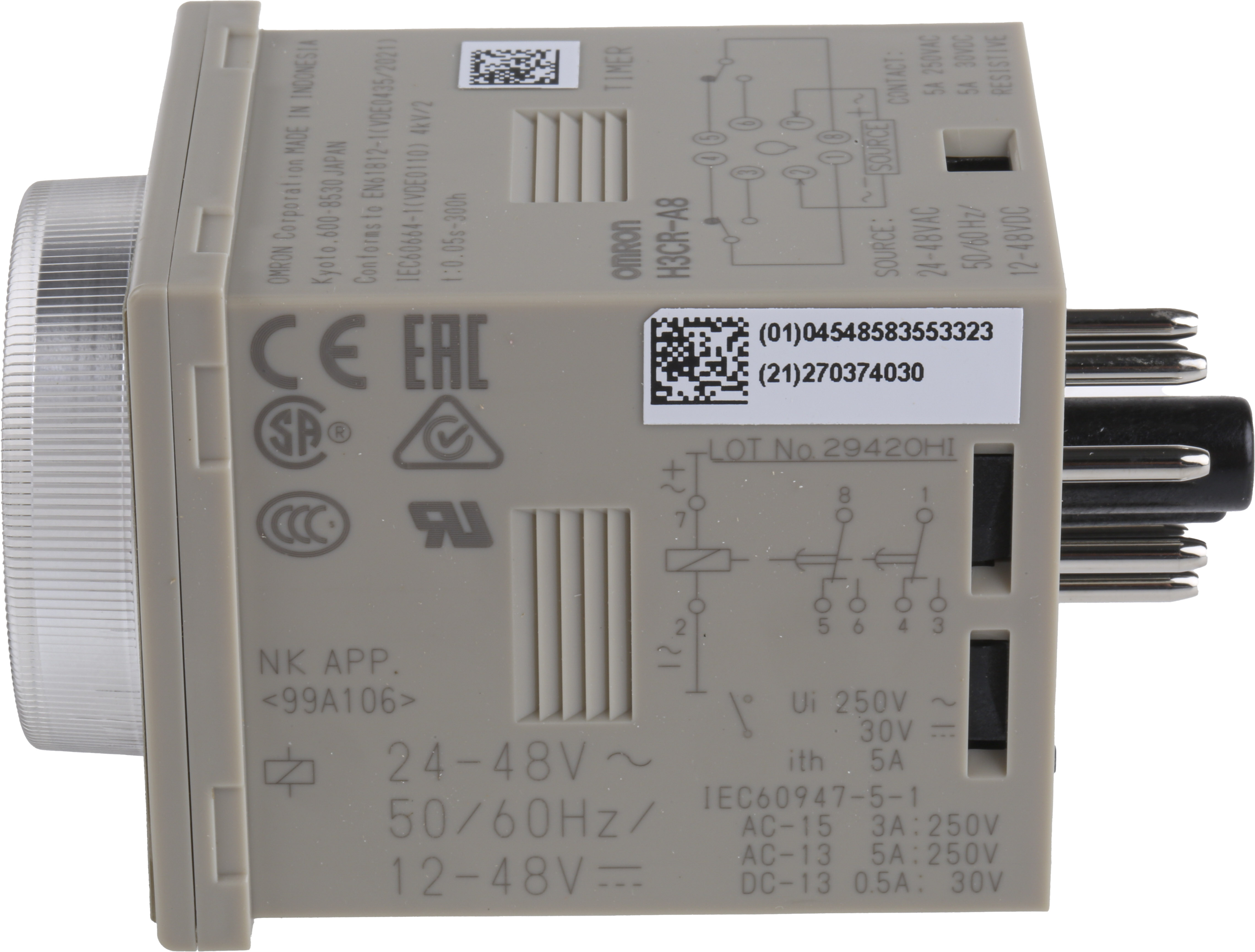 The Omron H3CR-A8 AC24-48/DC12-48 is a versatile and reliable timing device designed for precise control in various applications. It features an 8-pin connector and offers a wide timing range from 0.05 seconds to 300 hours, making it suitable for diverse timing requirements. This relay includes two DPDT (Double Pole Double Throw) contacts, ensuring dependable switching performance. Its robust design is compatible with AC24-48V and DC12-48V power supplies, offering flexibility in different power systems.