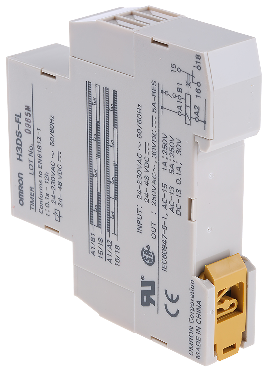 The Omron H3DS‑FL Twin Timer Relay is a highly versatile timing solution built for precision and reliability in UK automation systems. Designed in a slim 17.5 mm DIN‑rail format, it allows independent ON‑ and OFF‑time settings from 0.1 seconds up to 12 hours, and supports wide input voltages from 24‑230 VAC or 24‑48 VDC. With a robust 5 A SPDT output and repeat‑cycle function (ON‑start or OFF‑start), this analogue timer delivers dependable performance across various industrial applications. Trusted for its compact form, user‑friendly dial adjustments, and long service life, it is ideal for installation in control panels, machinery bins, and OEM systems across the UK.
