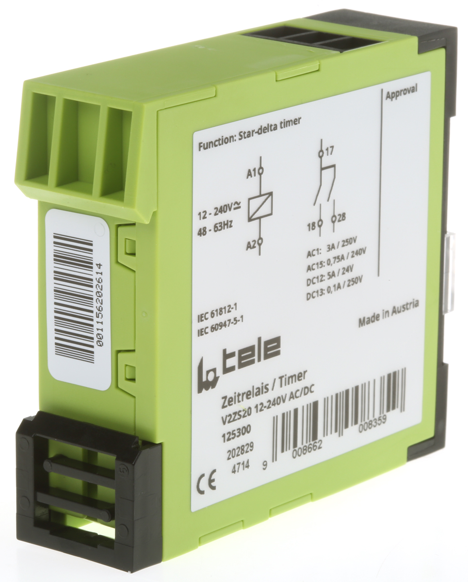 This is Interval Single Timer Relay Screw 0.5 → 10 s 1.5 → 30 s 3 → 60 s 9 → 180 s SPNO manufactured by Tele. The manufacturer part number is V2ZS20 12-240V AC/DC. Additionally, its time delay is about > 200ms . It also carries (dc-13) 0.1 a, (ac-15) 0.75 a, (ac-1) 3 a, (dc-12) 5a maximum current. The product is available in din rail configuration. The product v2zs20, is a highly preferred choice for users. It has a standard 0.5 → 10 s, 1.5 → 30 s, 3 → 60 s, 9 → 180s time range . It includes a/an internal power supply . Its accurate length is 76mm. Its mode of operation is interval . The contact is equipped with spst configuration. Furthermore, the product is 22.5mm wide. The product comes in 67mm depth. Features 12 → 240v ac/dc supply voltage. Whereas, the minimum operating temperature of the product is -25°c. It includes a single functions timer . The product contains 2 contacts. It has a maximum operating temperature of +60°c. The terminal is a screw type. The product is made from sturdy silver alloy materials.
