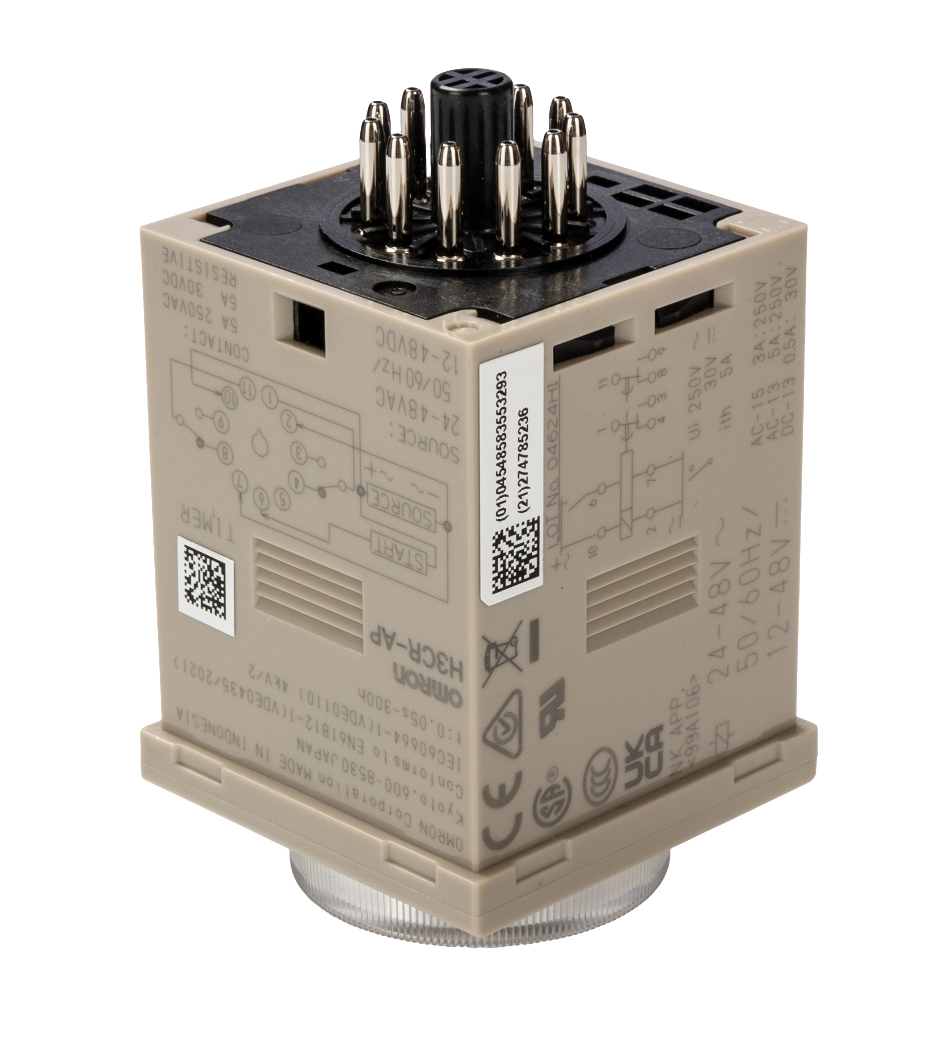 This is ON Delay Multi Function Timer Relay Crimp 0.05 s → 300 h DPDT 2 Contacts DPDT manufactured by Omron. The manufacturer part number is H3CR-AP AC24-48/DC12-48. It has a maximum 48v ac/dc voltage . Furthermore, the product is 48mm wide. Features 12 → 48 v dc, 24 → 48v ac supply voltage. It also carries 5a maximum current. It has a standard 0.05 s → 300h time range . Its mode of operation is on delay . It includes a multi function functions timer . It has a maximum operating temperature of +55°c. The terminal is a crimp type. Its time increment is in hours, minutes, seconds . It includes a/an internal power supply . It is created with a/an dpdt switch configuration . The contact is equipped with dpdt configuration. Its accurate length is 48mm. It has a minimum 12 v dc, 24v ac voltage . The product is available in din rail configuration. The product h3cr, is a highly preferred choice for users. The product comes in 81.6mm depth. It has a minimum 10ma current . Whereas, the minimum operating temperature of the product is -10°c. The product contains 2 contacts. The product is made from sturdy ag alloy materials.