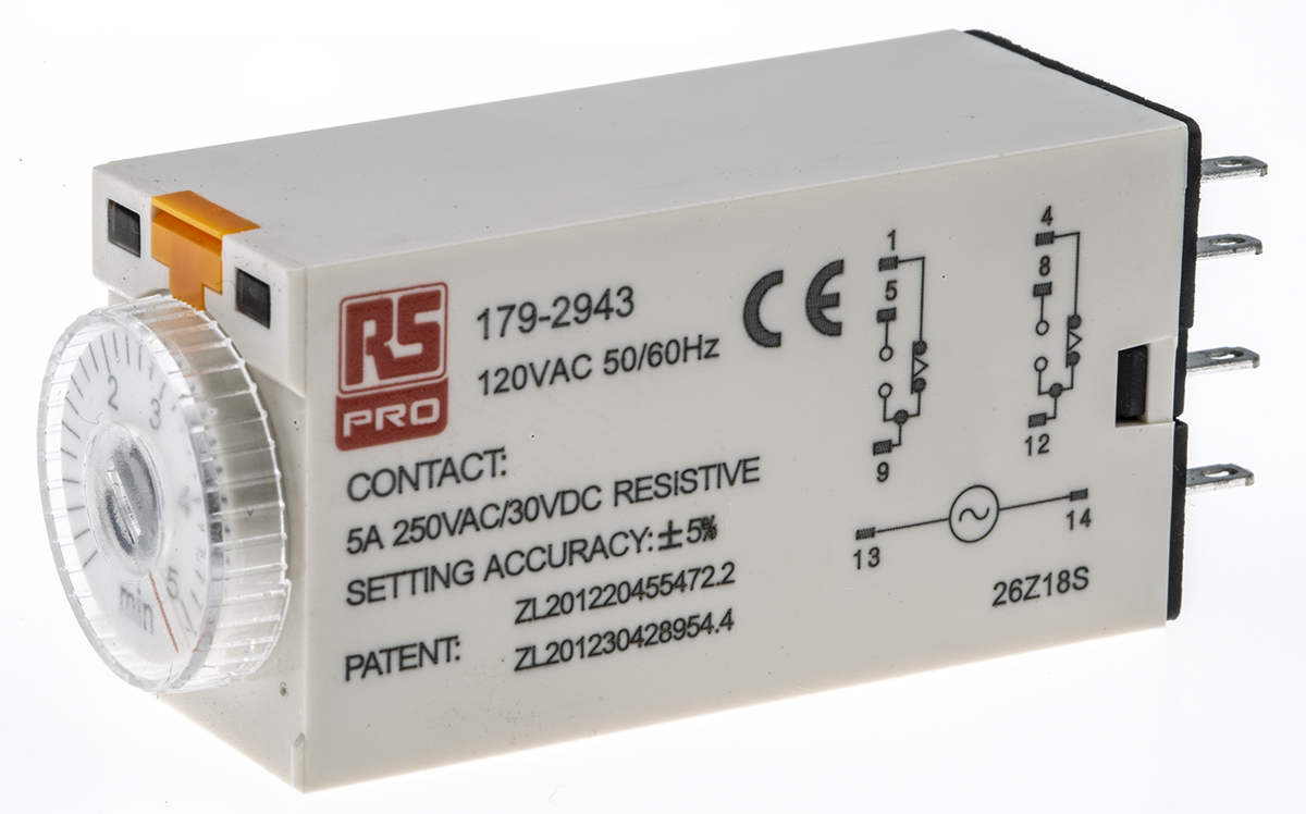 This is Analogue Time Relay. 8 pin DPCO manufactured by RS PRO. The manufacturer part number is 179-2943. Additionally, its time delay is about 0.2s . Its time increment is in minutes . The product is available in plug in configuration. It also carries 5a maximum current. It has a standard 0.2 → 5min time range . It has a maximum 110v ac voltage . Its accurate length is 53mm. Its mode of operation is on delay . The contact is equipped with dpdt configuration. Furthermore, the product is 21.5mm wide. The product comes in 2.8mm depth. Features 110v ac supply voltage. Whereas, the minimum operating temperature of the product is -10°c. It includes a single functions timer . It is created with a/an dpdt switch configuration . The product contains 2 contacts. It has a maximum operating temperature of +55°c. The terminal is a 8-pin connector type.
