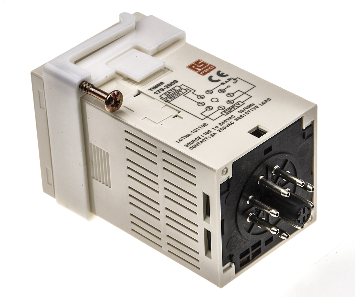 This is TCN. Digital Time Relay. Thumbwheel cont manufactured by RS PRO. The manufacturer part number is 179-2909. Additionally, its time delay is about 0.5s . Its time increment is in minutes, seconds . The product is available in plug in configuration. It also carries 5a maximum current. It has a standard 99m 59s time range . It has a maximum 240v ac voltage . Its accurate length is 48mm. Its mode of operation is power on delay . The contact is equipped with spdt configuration. Furthermore, the product is 48mm wide. The product comes in 72.5mm depth. Features 100 → 240v ac supply voltage. It includes a single functions timer . It has a minimum 100v ac voltage . The product contains 8 contacts. It is created with a/an spdt switch configuration . The terminal is a 8-pin connector type.