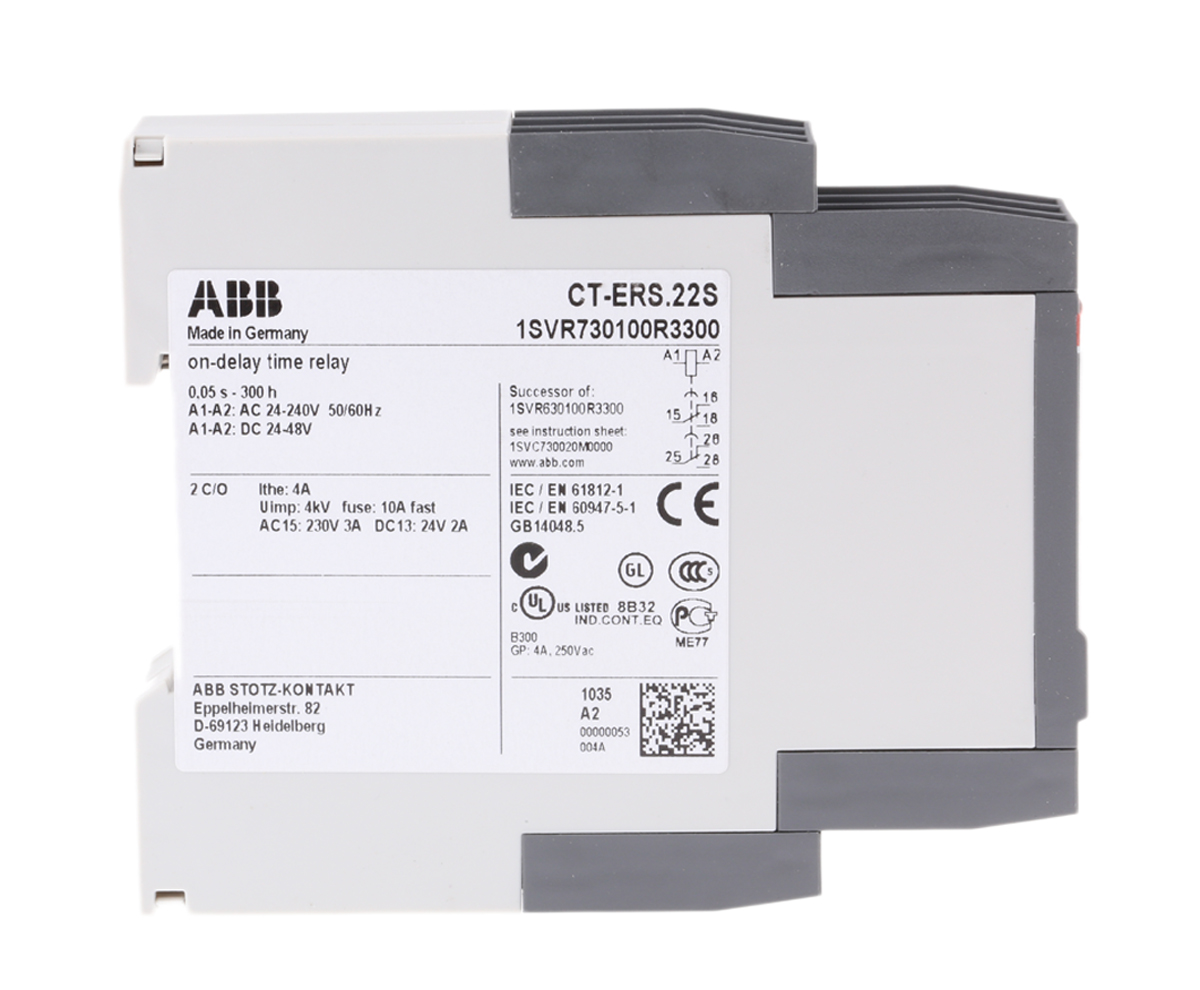 This is Timer Relay manufactured by ABB. The manufacturer part number is 1SVR730100R3300 CT-ERS.22S. Additionally, its time delay is about <80 (recovery)ms . Its time increment is in hours, seconds . The product is available in din rail configuration. It has a maximum 48v dc voltage . It has a standard 0.05 s → 300h time range . It includes a/an external power supply . Its accurate length is 85.6mm. Its mode of operation is on delay . Furthermore, the product is 22.5mm wide. The product comes in 113.4mm depth. Features 24 → 48v dc supply voltage. It includes a single functions timer . It has a minimum 24v dc voltage . The product contains 2 contacts.