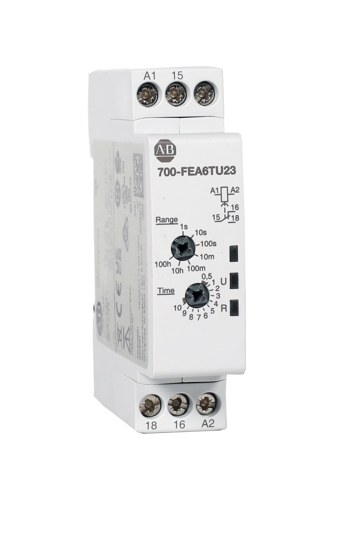 This is 700-FEA Series DIN Rail Mount Timer Relay 2-Contact 0.1 to 10h SPDT manufactured by Allen Bradley. The manufacturer part number is 700-FEA6TU23. The product is available in din rail configuration. The product 700-fea, is a highly preferred choice for users. It has a standard 0.1 to 10h time range . Its mode of operation is interval, on delay . The contact is equipped with spdt configuration. It includes a multi function functions timer . The product contains 2 contacts.