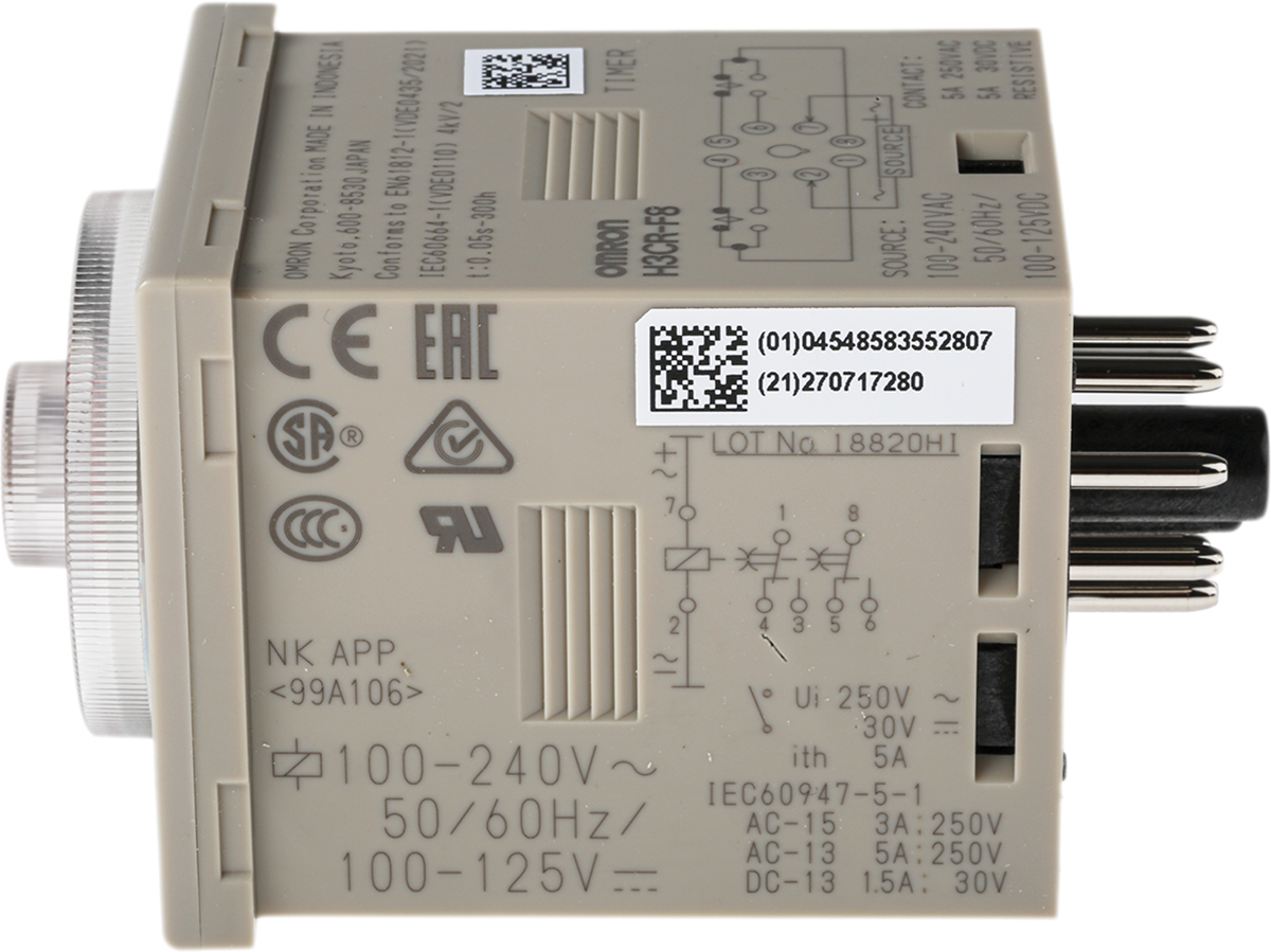 This is H3CR Series DIN Rail Panel Mount Timer Relay 100 → 240V ac 2-Contact 0.05 s → 300 h manufactured by Omron. The manufacturer part number is H3CR-F8 100-240VAC/100-125VDC. It has a maximum 30 v dc, 250v ac voltage . Furthermore, the product is 48mm wide. Features 100 → 240v ac supply voltage. It also carries 5a maximum current. It has a standard 0.05 s → 300 h time range . Its mode of operation is flicker off . It includes a single functions timer . It has a maximum operating temperature of +55°c. The terminal is a 8-pin connector type. Additionally, its time delay is about 0.1s . Its time increment is in hours, seconds . It includes a/an external power supply . It is created with a/an dpdt switch configuration . The contact is equipped with dpst configuration. Its accurate length is 48mm. The product is available in din rail, panel mount configuration. The product h3cr, is a highly preferred choice for users. The product comes in 84mm depth. Whereas, the minimum operating temperature of the product is -10°c. The product contains 2 contacts. The product is made from sturdy ag alloy materials.