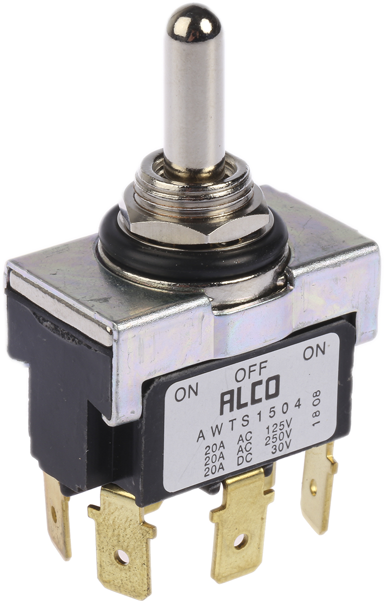 This is DPDT Toggle Switch (On)-Off-(On) IP67 Panel Mount manufactured by TE Connectivity. The manufacturer part number is AWTS1504. It features a 10mω contact resistance. The actuator is a 17.5mm long. The product has -20 → +70°c of operating temperature range. The product is available in panel mount configuration. It is IP rated with ip67. The rated contact current is 20 a @ 250 v ac. The contact is equipped with dpdt configuration. The actuator is designed from sturdy brass material. Whereas, the minimum operating temperature of the product is -20°c. The product also provide mechanical stability with 40000cycles. It provides (on)-off-(on) switch operation. It has a maximum operating temperature of +70°c. The terminal is a tab type. The product is made from sturdy silver plated materials. It is assigned with possible HTSUS value of 8536.50.9065. It is shipped in tray package . The product is rohs compliant. Moreover, it corresponds to awts15, a base product number of the product. The product is designated with the ear99 code number.