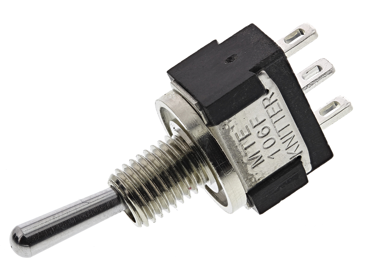 This is SPDT Toggle Switch (On)-On IP67 Panel Mount manufactured by KNITTER-SWITCH. The manufacturer part number is MTE 106 F. It features a <10mω contact resistance. Its panel cut out is 5.5mm in height . The actuator is a 10.5mm long. Its panel cut out is 6.1mm wide . The product is available in panel mount configuration. It is IP rated with ip67. The rated contact current is 4 a @ 30 v dc. The product has -45 → +140°c of operating temperature range. The panel cut out size includes 6.1mm. The contact is equipped with spdt configuration. Whereas, the minimum operating temperature of the product is -45°c. The product also provide mechanical stability with 100000operations. It provides on-(on) switch operation. It has a maximum operating temperature of +140°c. The terminal is a solder type. The product is made from sturdy silver plated copper alloy materials.