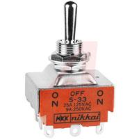 This is SWITCH STANDARD SIZE TOGGLE SOLDER LUG TERMINALS 3PDT ON-OFF-ON manufactured by NKK Switches. The manufacturer part number is S33-RO.