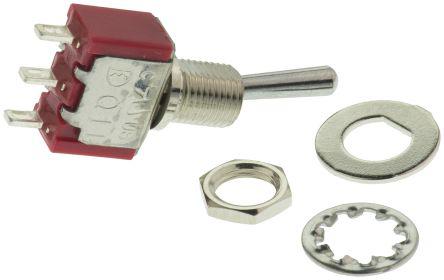 This is Single Pole Double Throw (SPDT) Toggle Switch Latching Panel Mount manufactured by RS Pro. The manufacturer part number is 734-7088. It features a 10mω contact resistance. The actuator is a 10.41mm long. The product complies with all safety standards, such as rohs & lead free. The product is available in panel mount configuration. The product has -30 → +85°c of operating temperature range. The rated contact current is 5 a @ 250 v ac. The panel has a 6.35mm cut-out diameter. The contact is equipped with spdt configuration. The panel cut out size includes 6.35mm. The actuator is designed from sturdy chromium plated brass material. Whereas, the minimum operating temperature of the product is -30°c. The product also provide mechanical stability with 40000cycles. It provides latching switch operation. It has a maximum operating temperature of +85°c. The terminal is a solder type. The product is made from sturdy silver plated brass materials.