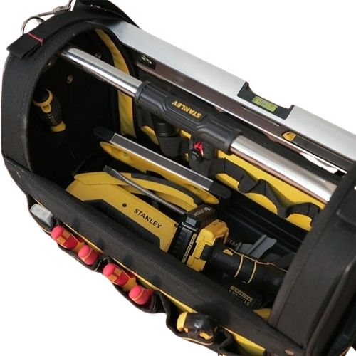 This is 600 Denier Fabric Leather Tool Bag 480mm x 250mm x 330mm manufactured by Stanley. The manufacturer part number is 1-93-951. The product is made from highly stable and reliable fabric. It includes a tool bag type bag . In addition, the height is 345mm. Furthermore, the product is 470mm wide. Its accurate length is 480mm. It has a shoulder strap included yes .
