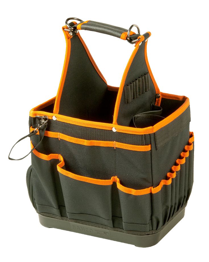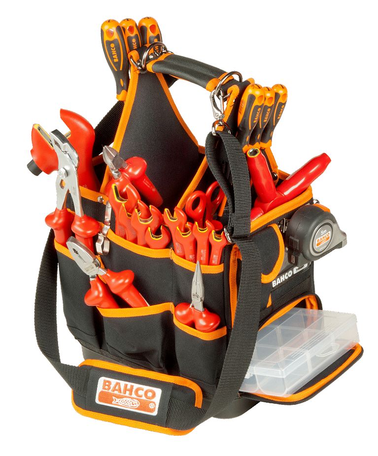 Bahco Electricians Tool Bag A reliable and useful open tool bag made from a combination of denier and polyester fabrics. It has a hard bottom for isolation and easy cleaning, with a padded shoulder strap in addition to the centred soft grip handle. The Bahco open tool bag is great choice for easy organisation and quick access to your tools making it an ideal choice for working professionals. Lots of pockets; mini pockets, elastics and dividers both outside and inside the bag for different tools Velcro straps for long tools and other accessories Measuring tape, card and phone holder section