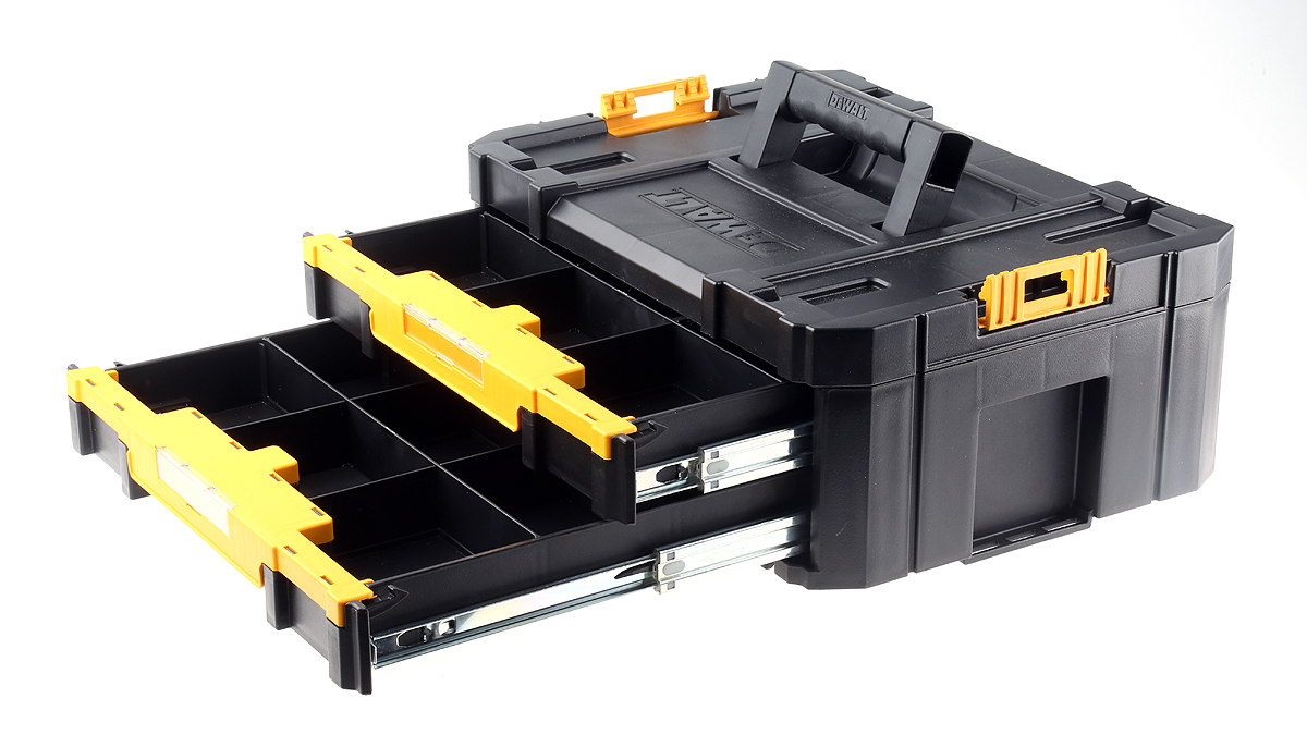 The Dewalt DWST1-70706 TStak Tool Storage Plastic Tool Box with 2 Drawers is a versatile storage solution designed to streamline organisation for both professionals and hobbyists. With dimensions of 314 x 440 x 176mm, it offers ample space while remaining portable and easy to transport. The sturdy plastic construction ensures durability, making it suitable for rugged environments.
