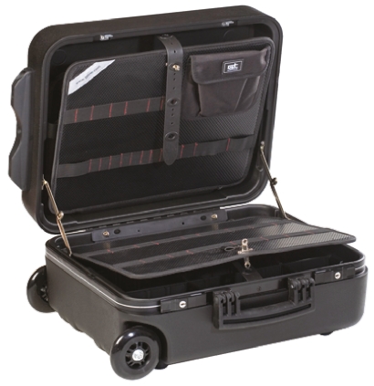 Double Walled Double walled design with high impact resistance Fully integrated and protected telescopic handle Large, well-placed ball bearing wheels give additional stability Soft-grip handle Stackable design 2 tool pallets and 4 small compartment organisers Full length piano hinge system Two lockable recessed latches Dimensions: 453 x 345 x 185mm Note Case supplied without tools.