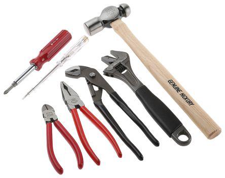 This is 7 Piece Maintenance Tool Kit manufactured by RS Pro. The manufacturer part number is 733-435. This is a type of maintenance, a set with user-desired tools. Moreover, it has cutters, hammer, pliers, screwdriver, spanners set contents . The product consists of 7 pieces. It has a roll type storage .