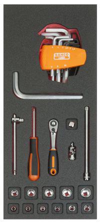 This is 27 Pieces Tool Kit manufactured by Bahco. The manufacturer part number is FF1E2003. This is a type of maintenance, a set with user-desired tools. Priced to Clear Options - yes. Moreover, it has ratchet, screwdriver, sockets set contents . It has a foam inlay type storage . The product consists of 27 pieces.