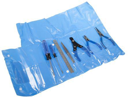 This is 7 Pieces Electronics Tool Kit manufactured by RS Pro. The manufacturer part number is 201-0009. This is a type of electronics, a set with user-desired tools. Moreover, it has 130 mm cable stripper; 4 1/2 in diagonal cutter; 10 mm semi-flush; 5 in long nose pliers half-round tapered jaws serrated; cross head screwdriver: #1 x 75 mm; 3.2 x 75 mm flat blade screwdriver; 6 in steel rule; 115 mm straight fine-point tweezer serrated jaws set contents . The product consists of 7 pieces.