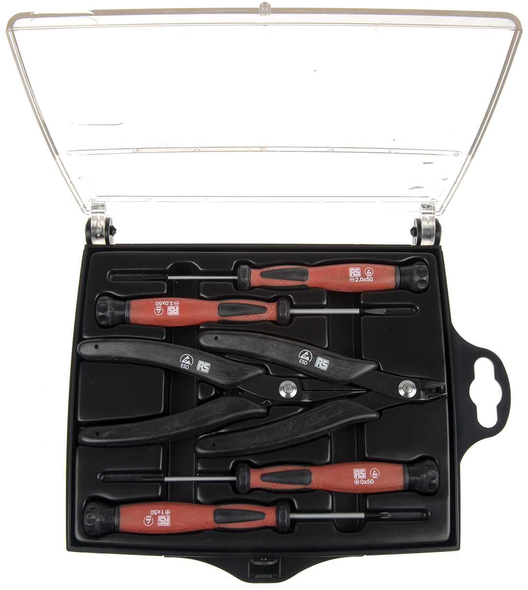 This is 6 Piece ESD Tool Kit manufactured by RS Pro. The manufacturer part number is 864-0870. This is a type of esd, a set with user-desired tools. VDE/1000V Approval Options - no. Moreover, it has cutters, pliers, screwdriver set contents . It has a case type storage . The product consists of 6 pieces.