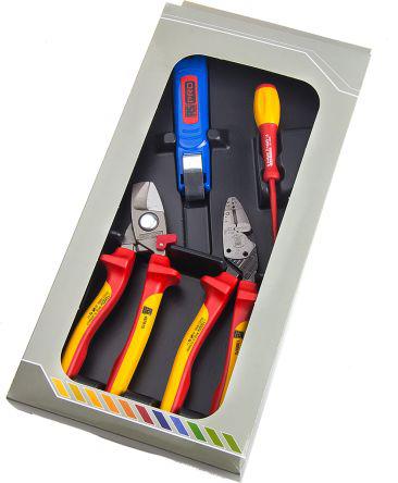 This is 4 Piece VDE/1000 V Electricians Tool Kit manufactured by RS Pro. The manufacturer part number is 136-6998. This is a type of electricians, a set with user-desired tools. VDE/1000V Approval Options - yes. Moreover, it has cutters, knife, screwdriver, shears set contents . The product consists of 4 pieces.