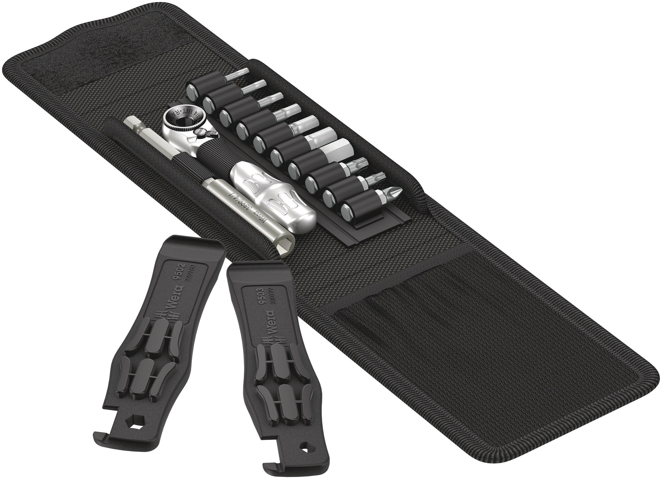 This is Bits assortment with ratchet manufactured by Wera. The manufacturer part number is 05004170001. This is a type of bicycle set 1, a set with user-desired tools. Moreover, it has bits, ratchet, wrench set contents . It has a bag type storage . The product consists of 12 pieces.