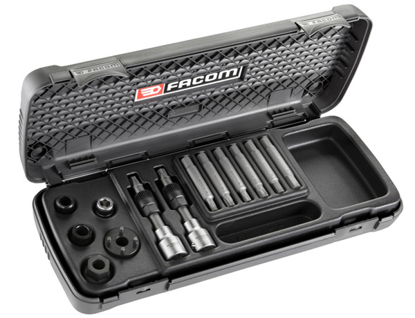 This is 13 Piece Automotive Tool Kit Tool Kit with Box manufactured by Facom. The manufacturer part number is DM.APR. This is a type of alternator pulley removal kit, a set with user-desired tools. Moreover, it has t40, t50, xzn m8, m10, hex 8 & 10 mm set contents . It has a case type storage . The product consists of 13 pieces.