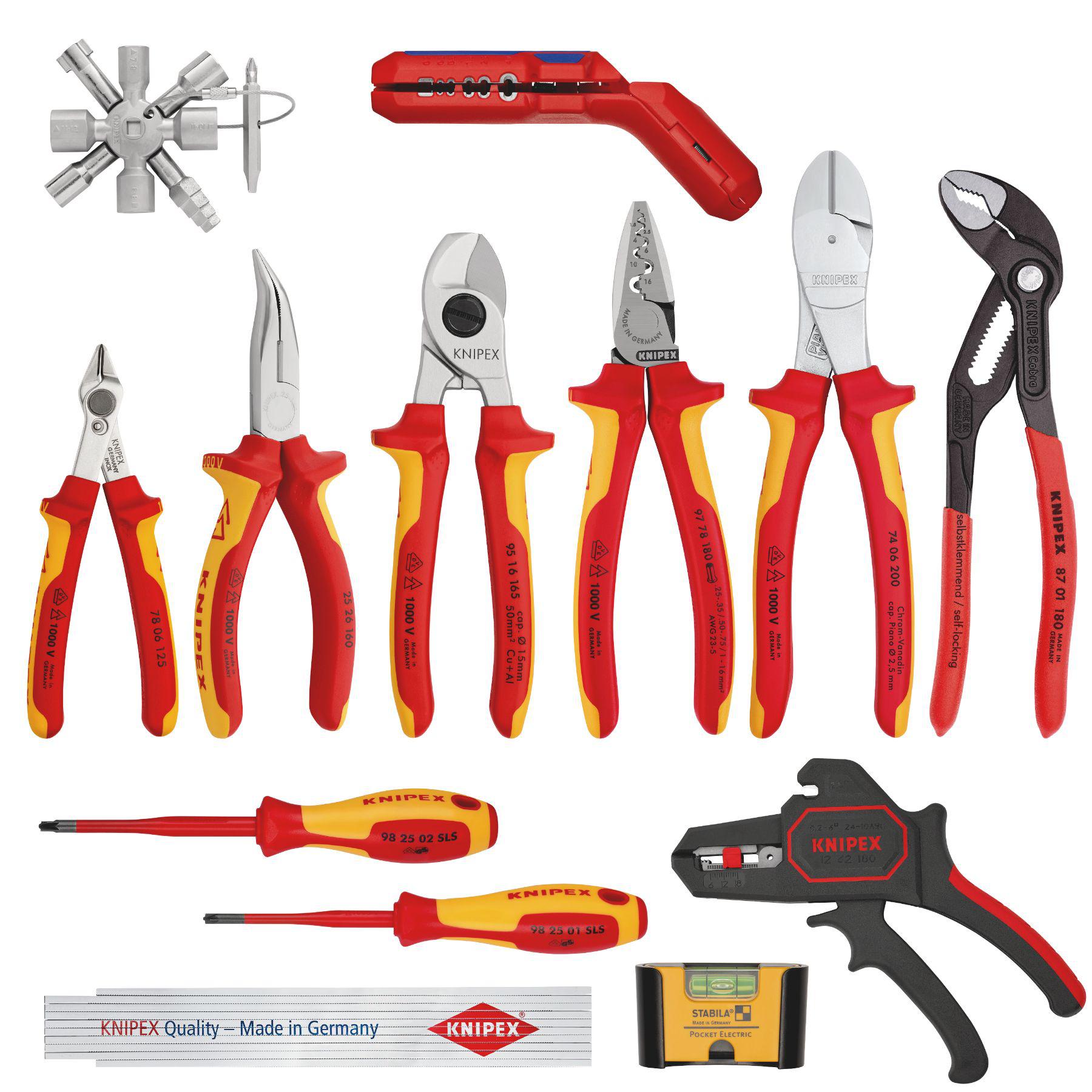 This is 11 Piece Tool Kit manufactured by Knipex. The manufacturer part number is 00 20 90 V02. The product consists of 13 pieces.