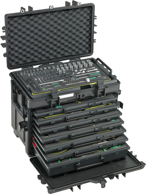 This is 163 Piece Automotive Tool Kit Tool Kit with Trolley manufactured by STAHLWILLE. The manufacturer part number is 98814915. This is a type of automotive tool kit, a set with user-desired tools. Moreover, it has 8 double hex sockets, 10 double hex sockets 1/4", 10 double hex sockets 3/8", double open-end wrench (1), long 1/4", pliers (5), quickrelease extensions (2), quickrelease line-tooth ratchet (1), quickrelease universal joint (1) set contents . It has a trolley type storage . The product consists of 163 pieces.