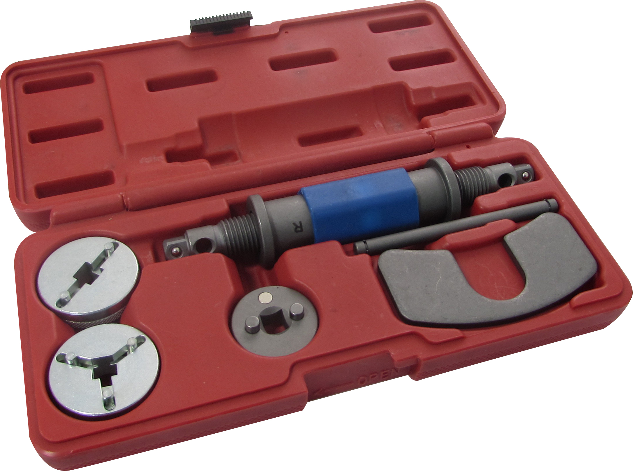 This is Piston Pusher Kit Tool Kit with Box manufactured by SAM. The manufacturer part number is 3114-2. This is a type of piston pusher kit, a set with user-desired tools. Moreover, it has piston pushback, stud 3/8 adaptor, stud universal adaptor set contents . It has a box type storage .