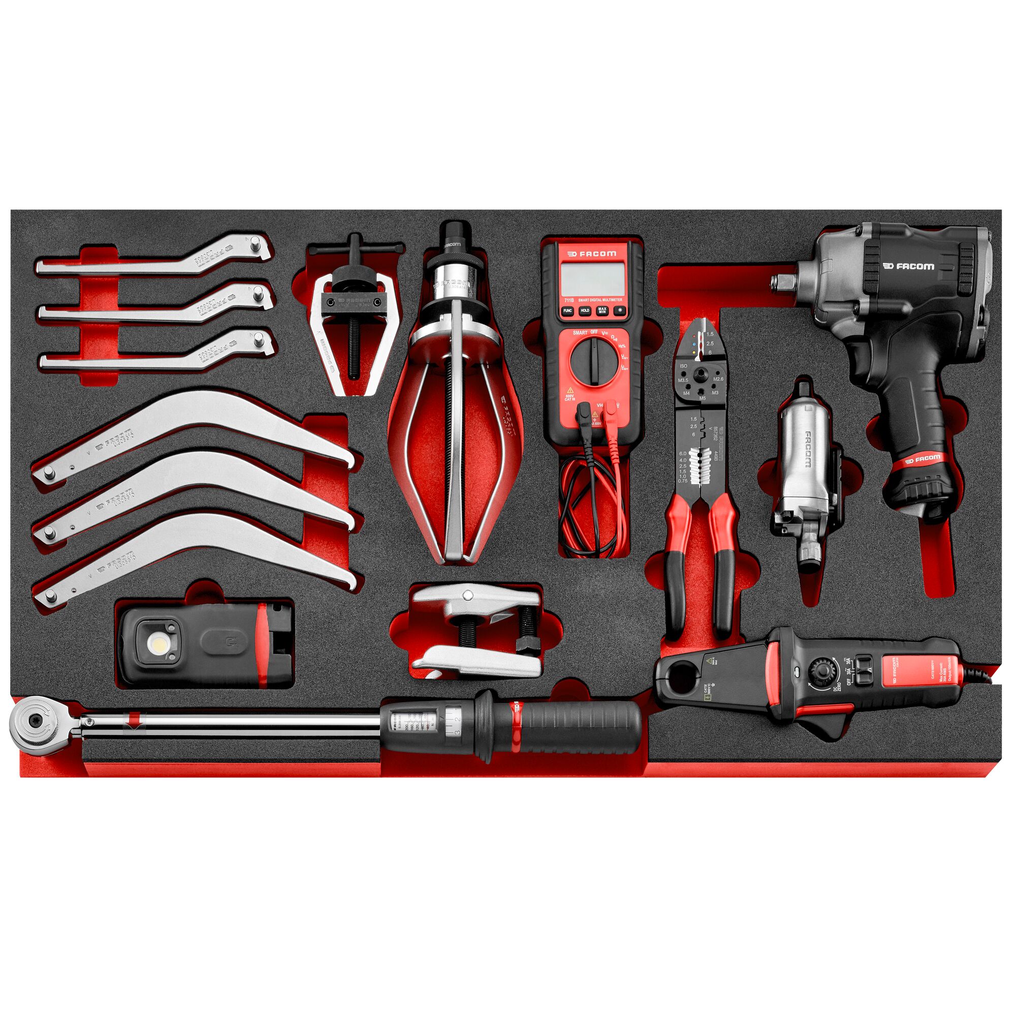 This is Workshop Tool Kit Tool Kit with Case manufactured by Facom. The manufacturer part number is MODM.XXL7PF. This is a type of workshop tool kit, a set with user-desired tools. Moreover, it has impact wrench, joint puller, replacement jaw set contents . It has a case type storage .