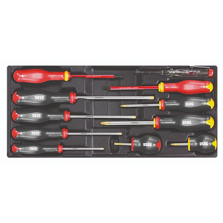 This is 11 Piece Automotive Tool Kit Tool Kit with Tray VDE Approved manufactured by Usag. The manufacturer part number is U05190762. VDE/1000V Approval Options - yes. It has a tray type storage . It has a model number u05190762. This is a type of automotive tool kit, a set with user-desired tools. Moreover, it has 091 - screwdrivers for slot-head screws - 1000 v, 091 ph - screwdrivers for phillips® screws - 1000 v, 321 f - phase-testing screwdriver 110÷250v, 324 - screwdrivers for slot-head screws, 324 n - screwdrivers for slot-head screws, 324 nph - screwdrivers for phillips® screws, 324 ph - screwdrivers for phillips® screws, 519/324bv - plastic tray (empty) set contents . The product consists of 11 pieces.