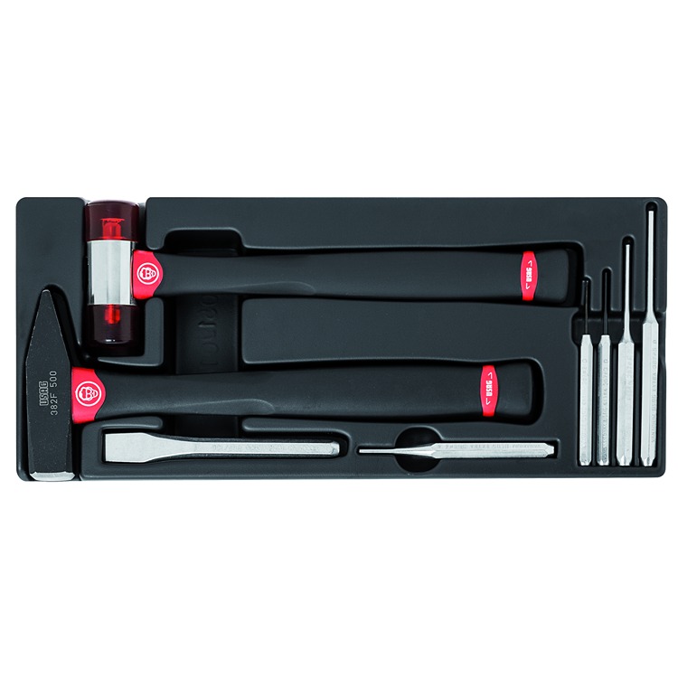 This is 8 Piece Automotive Tool Kit Tool Kit with Tray manufactured by Usag. The manufacturer part number is U05190828. This is a type of automotive tool kit, a set with user-desired tools. Moreover, it has 362 - chisels, 367 - pin punches, 368 - centre punches, 376 f - mallets with graphite handle, 382 f - hammers for mechanics with graphite handle, 519/382fav - plastic tray (empty) set contents . It has a tray type storage . It has a model number u05190828. The product consists of 8 pieces.