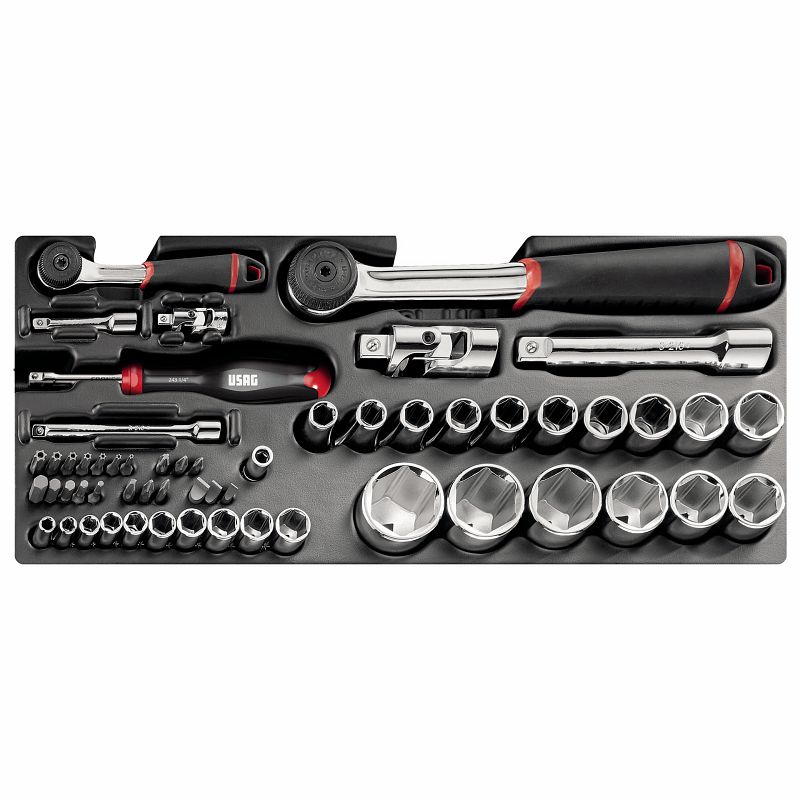 This is 56 Piece Automotive Tool Kit Tool Kit with Tray manufactured by Usag. The manufacturer part number is U05190839. This is a type of automotive tool kit, a set with user-desired tools. Moreover, it has 237 a 1/2 - reversible ratchet with sealed mechanism (certified ip51), 237 a 1/4 - reversible ratchet with sealed mechanism (certified ip51), 519/607acev - plastic tray (empty), 660 - bits for slot-head screws -1/4 in, 660 e - bits for hex socket screws -1/4 in, 660 ph - bits for phillips® screws -1/4 in, 660 pz - bits for pozidriv® - supadriv® screws -1/4 in, 660 stx - bits for torx® tamper resistant screws -1/4 in, 684 - bit-holder sockets, 235 1/2 en - hexagonal sockets, 235 1/4 en - hexagonal sockets, 236 1/2 - extensions, 236 1/4 - extensions, 241 1/2 - universal joint, 241 1/4 - universal joint, 243 1/4 - spinner with handle set contents . It has a tray type storage . It has a model number u05190839. The product consists of 56 pieces.