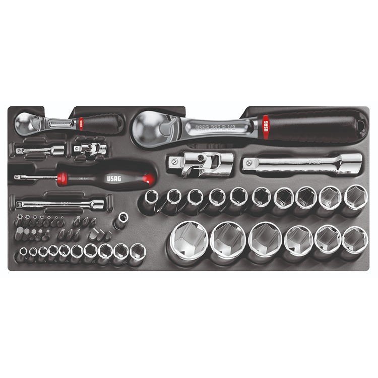 This is 56 Piece Automotive Tool Kit Tool Kit with Tray manufactured by Usag. The manufacturer part number is U05190840. This is a type of automotive tool kit, a set with user-desired tools. Moreover, it has 237 b 1/2 - reversible ratchet with sealed mechanism, 237 b 1/4 - reversible ratchet with sealed mechanism, 519/607acev - plastic tray (empty), 660 - bits for slot-head screws -1/4 in, 660 e - bits for hex socket screws -1/4 in, 660 ph - bits for phillips® screws -1/4 in, 660 pz - bits for pozidriv® - supadriv® screws -1/4 in, 660 stx - bits for torx® tamper resistant screws -1/4 in, 684 - bit-holder sockets, 235 1/2 en - hexagonal sockets, 235 1/4 en - hexagonal sockets, 236 1/2 - extensions, 236 1/4 - extensions, 241 1/2 - universal joint, 241 1/4 - universal joint, 243 1/4 - spinner with handle set contents . It has a tray type storage . It has a model number u05190840. The product consists of 56 pieces.