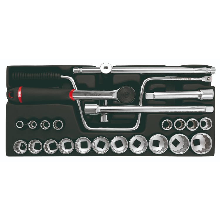 This is 25 Piece Automotive Tool Kit Tool Kit with Tray manufactured by Usag. The manufacturer part number is U05190810. This is a type of automotive tool kit, a set with user-desired tools. Moreover, it has 237 a 1/2 - reversible ratchet with sealed mechanism (certified ip51), 519/607cv - plastic tray (empty), 235 1/2 n - bihexagonal sockets, 236 1/2 - extensions, 239 1/2 n - speed brace with revolving handle, 240 1/2 n - t-handle with sliding square drive, 241 1/2 - universal joint set contents . It has a tray type storage . It has a model number u05190810. The product consists of 25 pieces.