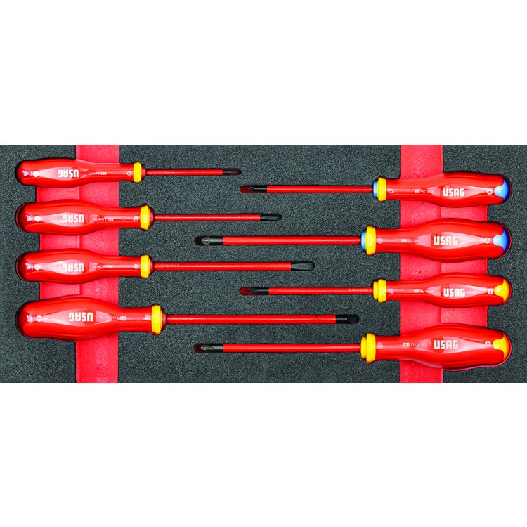 This is 8 Piece Automotive Tool Kit Tool Kit with Tray VDE Approved manufactured by Usag. The manufacturer part number is U05191016. VDE/1000V Approval Options - yes. It has a tray type storage . It has a model number u05191016. This is a type of automotive tool kit, a set with user-desired tools. Moreover, it has 091 - screwdrivers for slot-head screws - 1000 v, 091 ph - screwdrivers for phillips® screws - 1000 v, 091 pz - screwdrivers for pozidriv® - supadriv® screws - 1000 v, 519 m 091av - bi-colour foam module (empty) set contents . The product consists of 8 pieces.