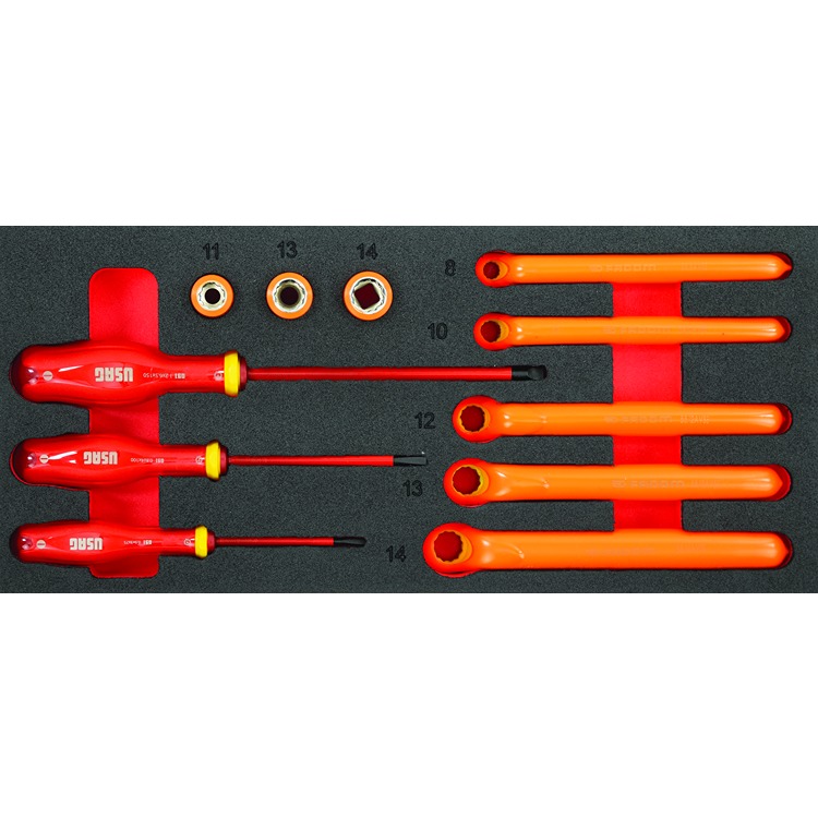 This is 11 Piece Automotive Tool Kit Tool Kit with Tray VDE Approved manufactured by Usag. The manufacturer part number is U05190155. VDE/1000V Approval Options - yes. It has a tray type storage . It has a model number u05190155. This is a type of automotive tool kit, a set with user-desired tools. Moreover, it has 091 - screwdrivers for slot-head screws - 1000 v, 099 b - offset bihexagonal ring wrenches - 1000 v, 519 m 098hyb11v - bi-colour foam module (empty), 098 3/8 - bihexagonal sockets - 1000 v set contents . The product consists of 11 pieces.