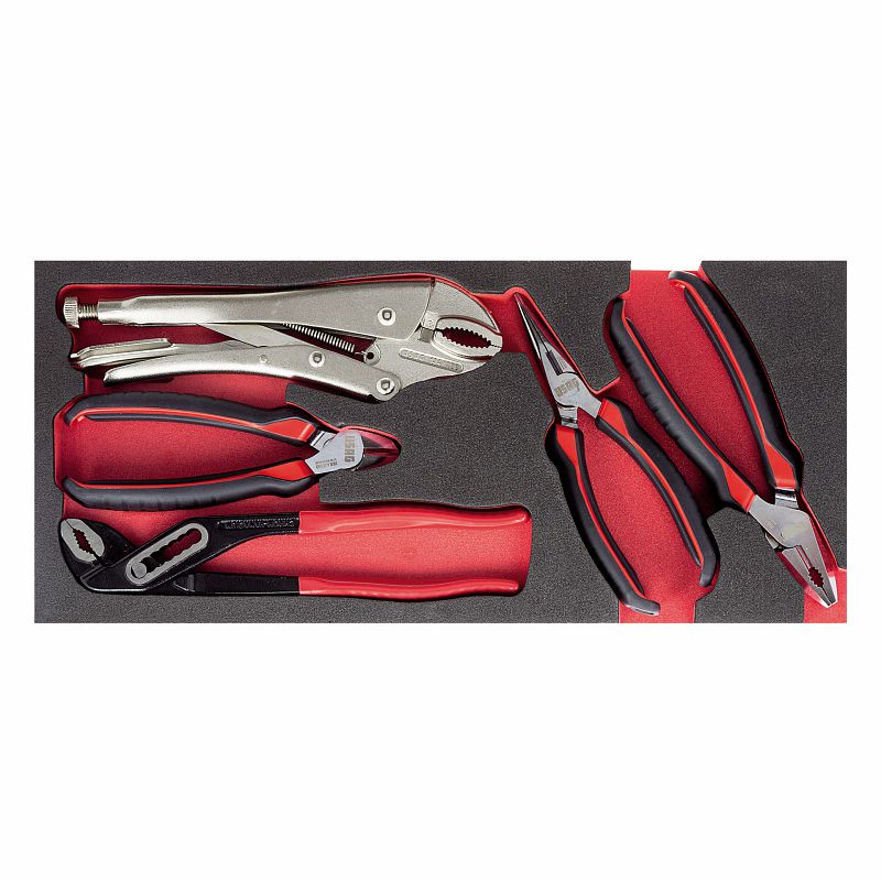 This is 5 Piece Automotive Tool Kit Tool Kit with Tray manufactured by Usag. The manufacturer part number is U05190965. This is a type of automotive tool kit, a set with user-desired tools. Moreover, it has 133 ax - half-round extra-long nose pliers with straight jaws, 134 - lock-grip pliers with concave jaws, 150 ax - combination pliers, 180 c - box-joint adjustable pliers, 188 ax - heavy-duty diagonal cutting nippers, 519 m 150axav - bi-colour foam module (empty) set contents . It has a tray type storage . It has a model number u05190965. The product consists of 5 pieces.