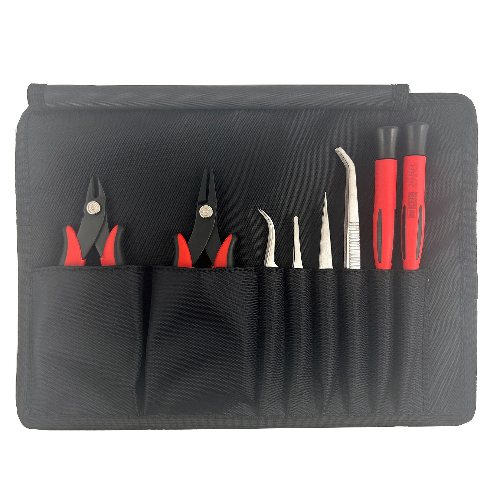 This is 8 Piece Tool Set Tool Kit with Roll manufactured by RS PRO. The manufacturer part number is 429-664. It has a roll type storage . This versatile kit contents include 1 medium pliers, 2 screwdrivers, 1 medium cutter, 4 tweezers components. This is a type of tool, a set with user-desired tools. tool kit is a versatile product designed to provide user-defined applications. The product consists of 8 pieces.