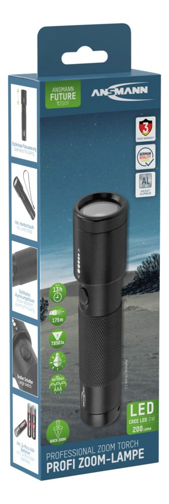 This is T200F LED Handheld LED Torch manufactured by Ansmann. The manufacturer part number is 1600-0138-520. It includes a hand style torch . Moreover, it is rechargeable no . The diameter of the head is [Head diameter]. It is IP rated with ip54. Features luminosity up to 200 lm. It has a decent black colour. Water Resistant Options - yes. Its accurate length is 135 mm. Its beam type is flood, spot . Furthermore, the product is 31 mm wide. It features 175 m range. Its overall weight with batteries is 146g . It includes a standard 3x aaa batteries . It has a model t200f. It is a type of led lamp. This product carries 3 w. The casing is constructed from highly stable aluminium material.