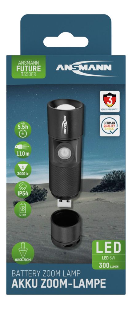 This is Future T350FR manufactured by Ansmann. The manufacturer part number is 1600-0247. It includes a torch style torch . Moreover, it is rechargeable yes . The diameter of the head is [Head diameter]. It is IP rated with ip54. Features luminosity up to 300 lm. It has a decent black colour. Its accurate length is 98.5 mm. Its beam type is flood, spot . The plug is a highly reliable usb with long service life. Furthermore, the product is 27 mm wide. It features 110 m range. Its overall weight with batteries is 93g . It includes a standard li-ion batteries . It has a model t350fr. It is a type of led lamp. This product carries 5 w. The casing is constructed from highly stable aluminium material.