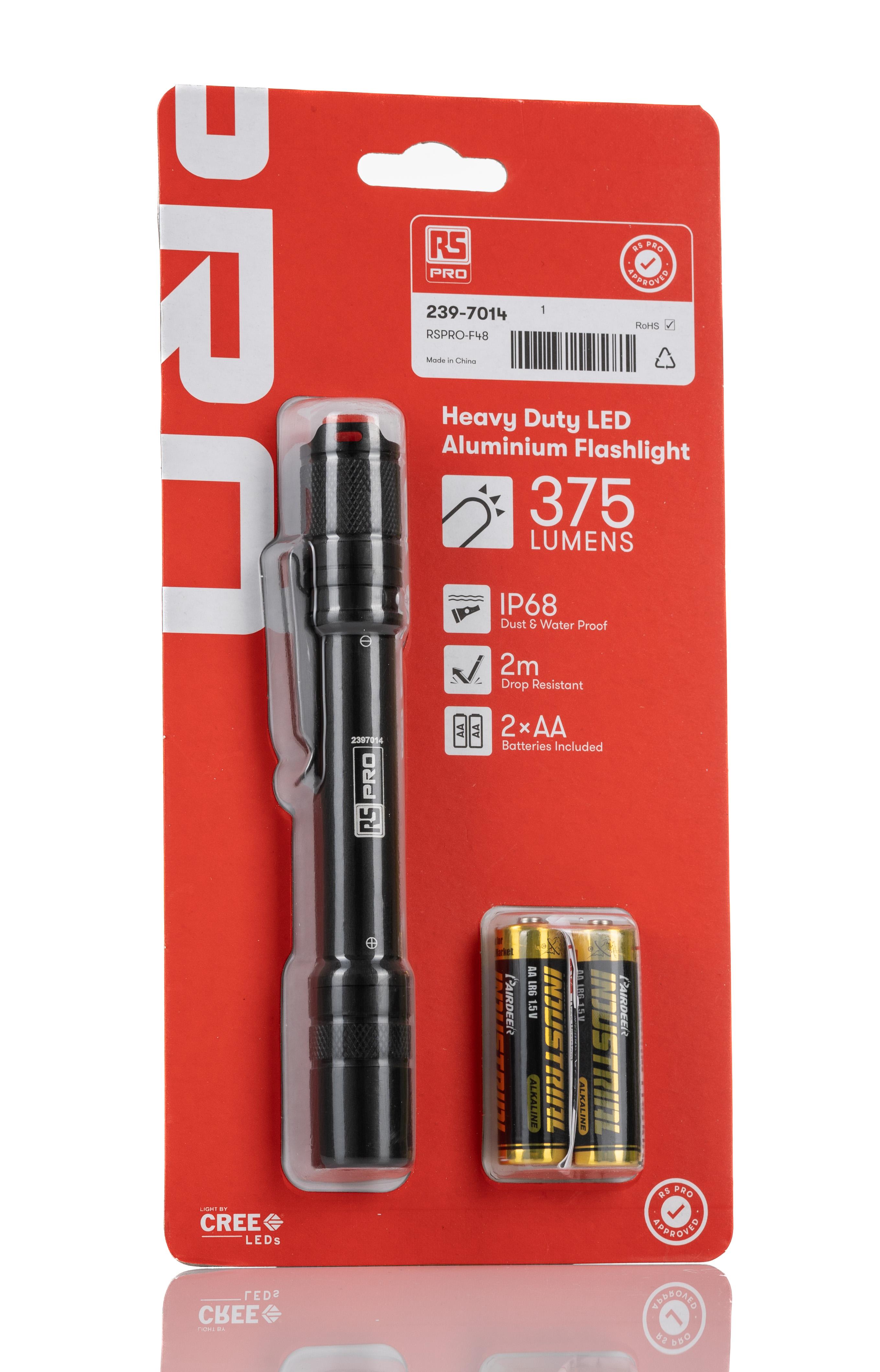 This is RSPRO-F48 LED - Flashlight Black 375 lm manufactured by RS PRO. The manufacturer part number is 239-7014. Moreover, it is rechargeable no . It is IP rated with ip68. Features luminosity up to 375 lm. It has a decent black colour. Water Resistant Options - yes. The casing is constructed from highly stable aluminium material. Its beam type is high/low . It includes a standard aaa batteries . It is a type of led lamp. It includes a torch style torch .