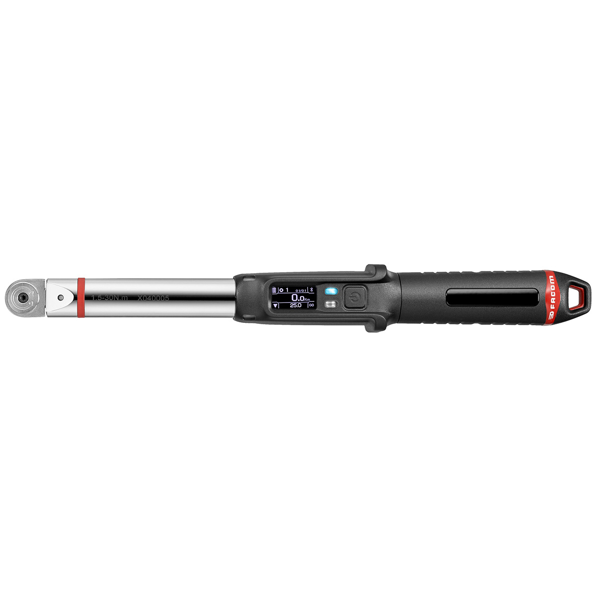 This is 1/4 in Square Drive Electronic Smart Torque Wrench 1.5to30Nm manufactured by Facom. The manufacturer part number is E.516ST-30PB. A quality product with a nice satin chrome finish. Its driver is of a/an square shape . The product is made from highly stable and reliable chrome vanadium steel. It has an overall length of 330 mm. Its scale graduations are about 0.1nm . In addition, its torque range is about 6 → 30nm . Its insert size is about 9 x 12mm . The product has a drive size of 1/4 in. It provides high accuracy of ±2 %.