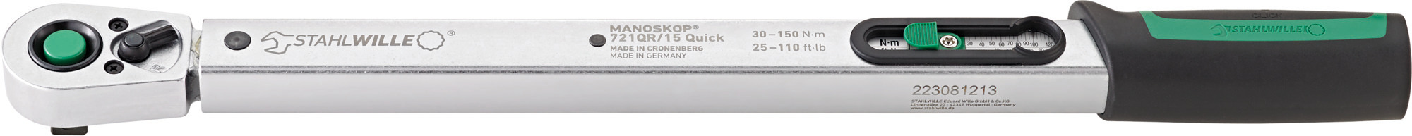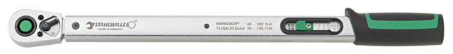 This is 721QR/20 Quick Click Torque Wrench 40 → 200Nm 1/2 in Drive Round Drive manufactured by STAHLWILLE. The manufacturer part number is 50204120. Its driver is of a/an round shape . Its scale graduations are about 5nm . In addition, its torque range is about 40 → 200nm . It has an overall length of 482 mm. The product has a drive size of 1/2 in. It has a model 721qr/20 quick. It provides high accuracy of ± 4 %.