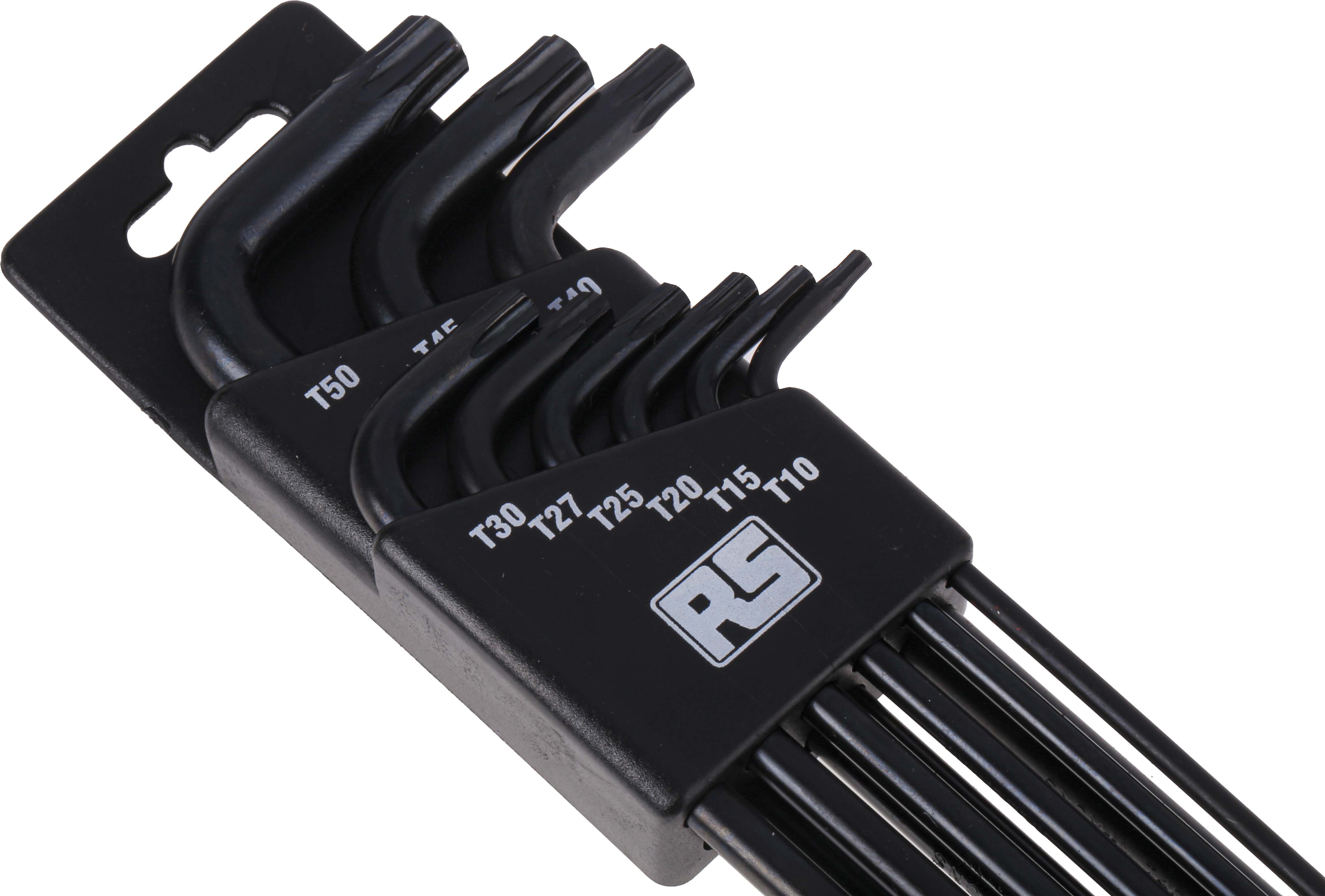 This is 9 Piece L Shape Torx Key Set T10; T15; T20; T25; T27; T30; T40. T45; T50 manufactured by RS Pro. The manufacturer part number is 451-8937. It is a l product with unique specifications. A quality product with a nice blackened finish. The product is made from highly stable and reliable chrome vanadium steel. Moreover, it has t10; t15; t20; t25; t27; t30; t40. t45; t50 set contents . The product consists of 9 pieces.
