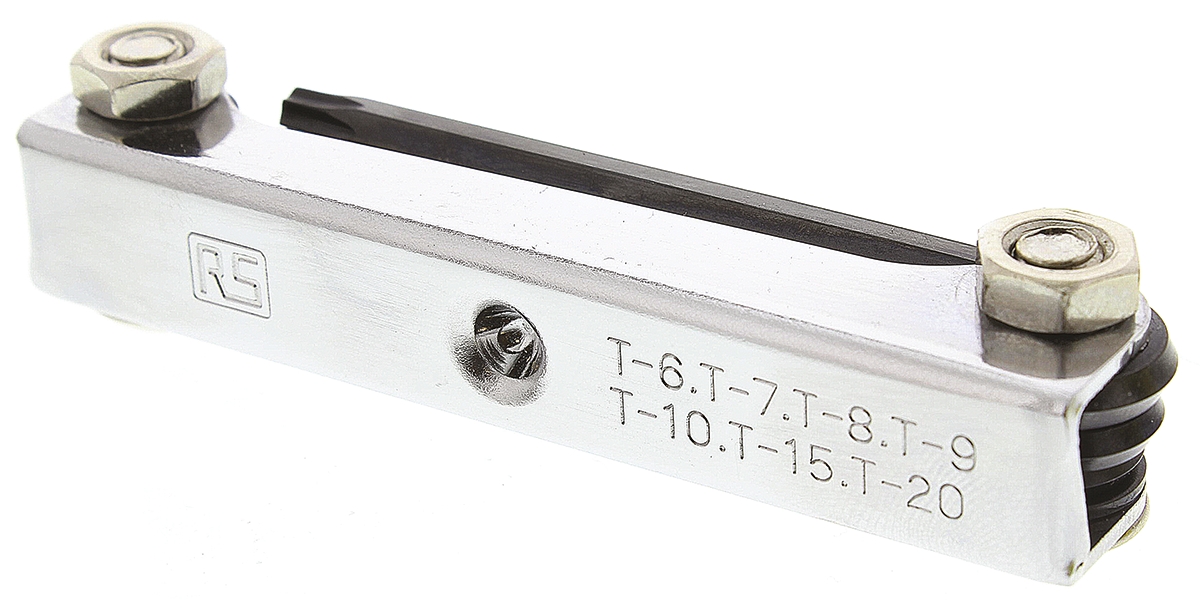 This is 7 piece Folding Torx key set Chrome Vanadium Steel manufactured by RS Pro. The manufacturer part number is 450-0037. Moreover, it has t6; t7; t8; t9; t10; t15; t20 set contents . A quality product with a nice gunmetal finish. The product is made from highly stable and reliable chrome vanadium steel. The product consists of 7 pieces.