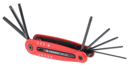 This is 8 piece Folding Torx key set manufactured by Facom. The manufacturer part number is 89R.JM8. A quality product with a nice burnished finish. The product is made from highly stable and reliable stainless steel. It is a folding product with unique specifications. Moreover, it has t8 - t10 - t15 - t20 - t25 - t27 - t30 - t40 set contents . Additionally, it has a short arm . The product consists of 8 pieces.